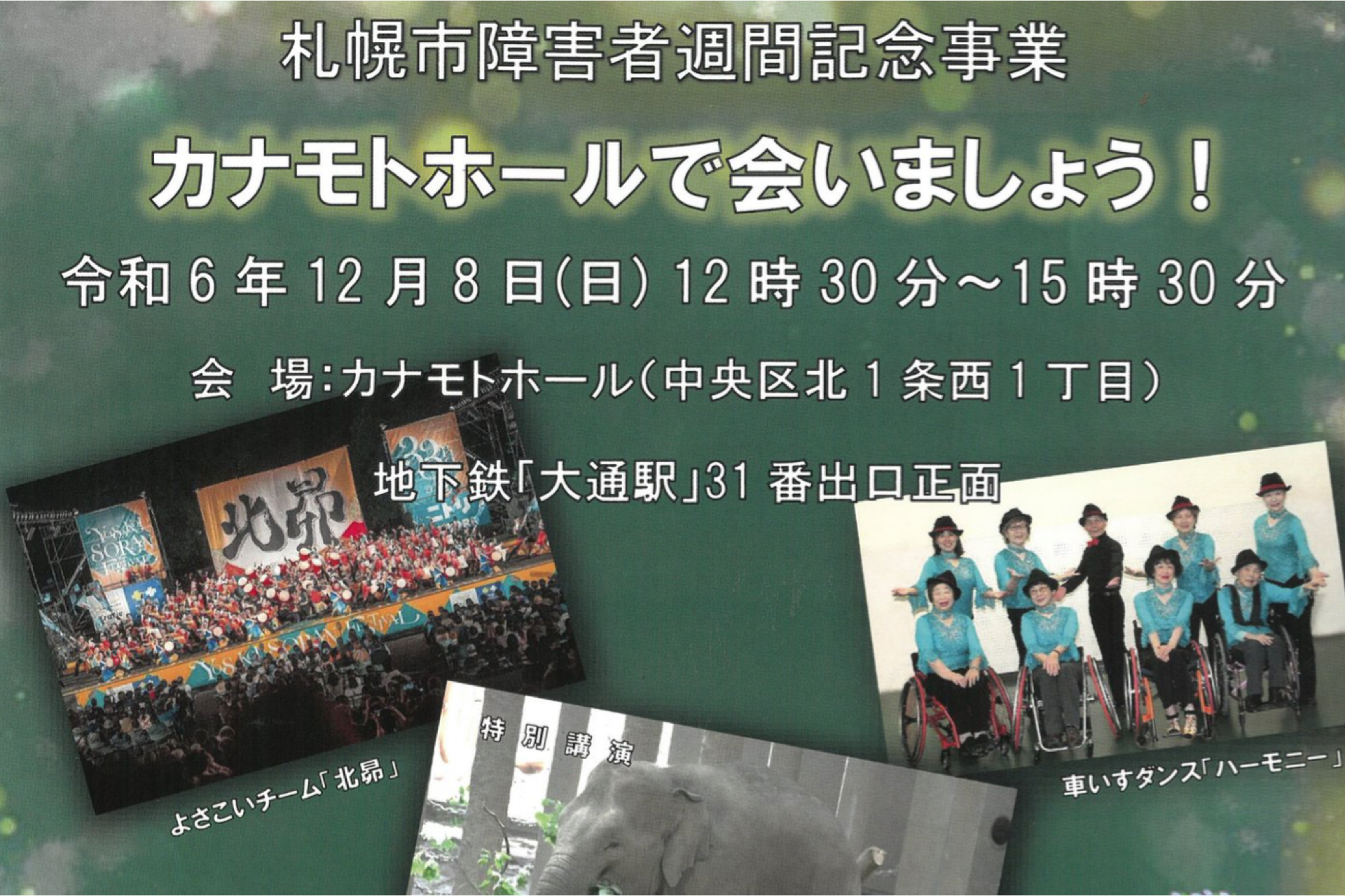 障がいのある方とない方との交流を促進する「カナモトホールで会いましょう!」開催!内容は、フルート演奏や車椅子ダンス、円山動物園に関する講演など盛りだくさんです。入場無料。詳細はHPから。