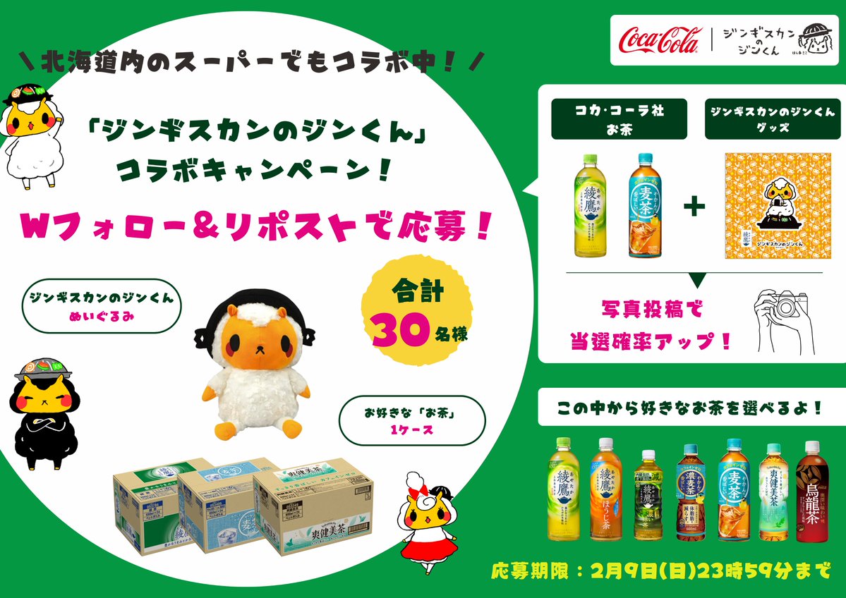3⃣コカ・コーラ社のお茶とジンギスカンのジンくんグッズの写真投稿で当選確率アップ!📸